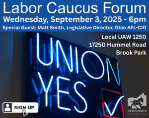 Labor Caucus Forum!! Please the Cuyahoga County Democratic Party on Wednesday, September 3, 2025 On Wednesday, September 3rd, the CCDP’s Labor Caucus will be holding its first ever forum. Too often, Democrats don’t know the full scope of union organizing, union needs, and union stances. We’ll hear from labor leaders like Ohio AFL-CIO Legislative Director Matt […]