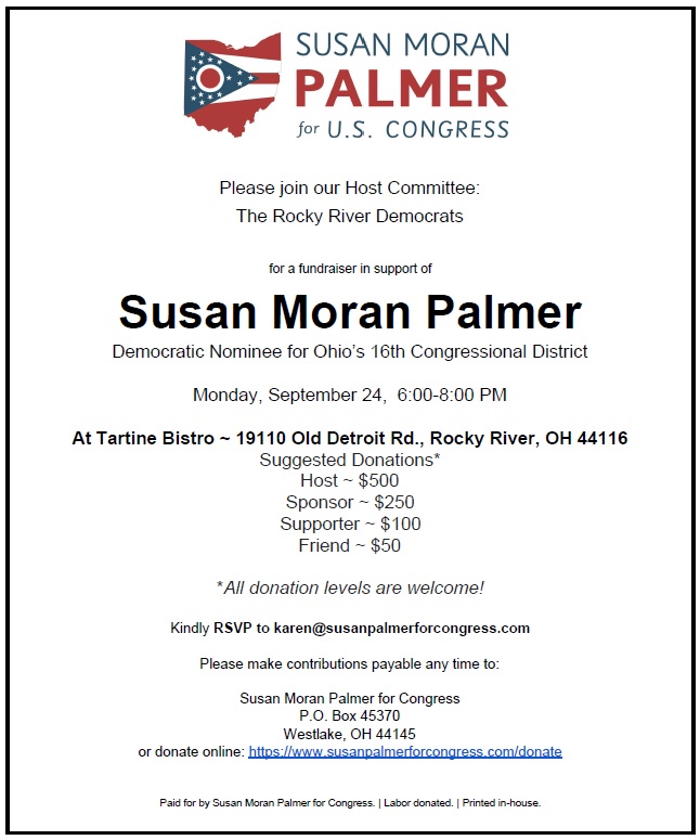 Our Congressional District 16 (Fairview Park, North Olmsted, Westlake, much of Rocky River and beyond) is Ohio’s only open congressional seat contest. With your support, our chances are very strong that Susan will replace Jim Renacci and represent our values in Congress.