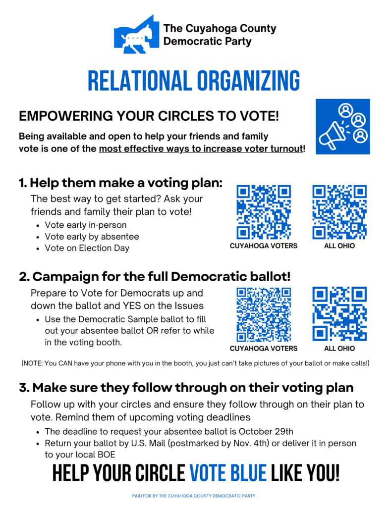 Want to help turnout voters for this pivotal election?! The Cuyahoga County Democratic Party has spearheaded an initiative to connect volunteers with disengaged/infrequent voters to help get people out to the polls in November! If you are interested or want more information, read HERE and please fill out the volunteer form HERE! You can get involved by sending bulk texts and person-to-person texts, handwritten postcards, or going canvassing!