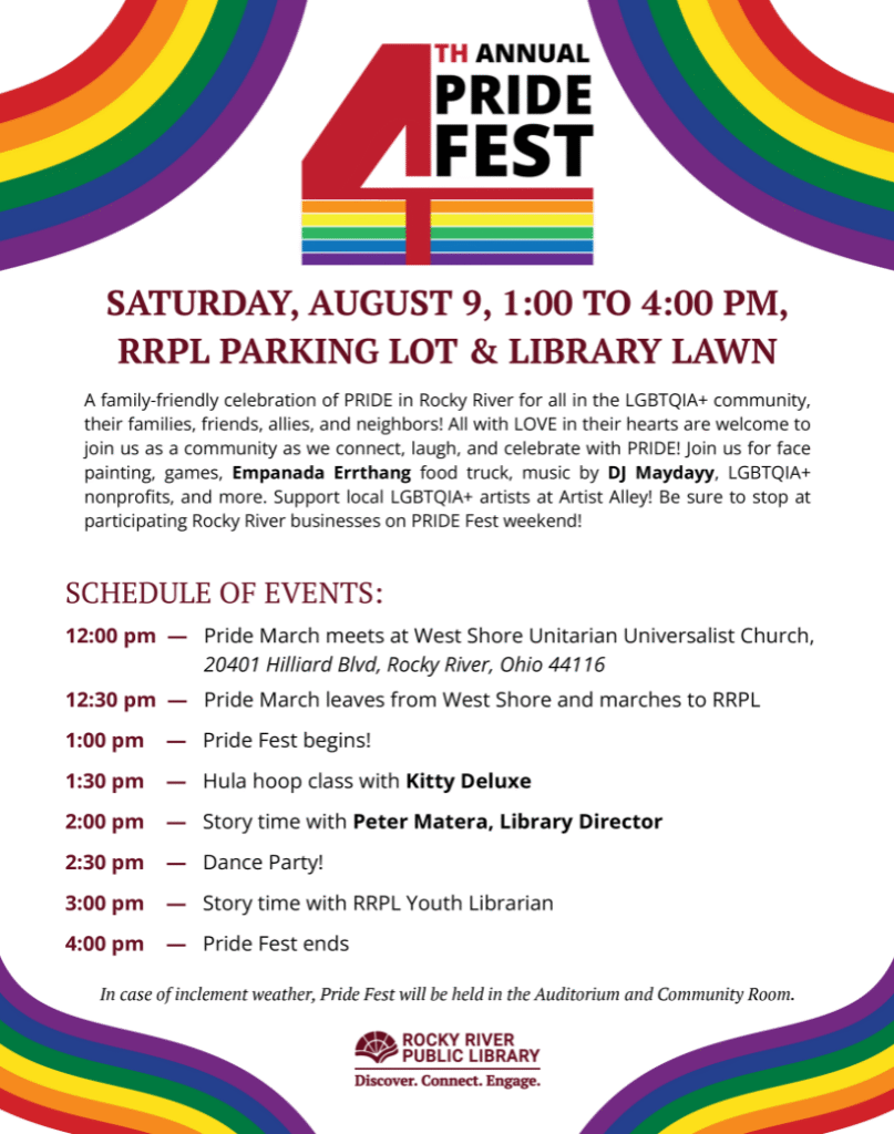 The Fourth Annual Rocky River Pride Celebration and March will take place this Saturday, August 9th, starting at the West Shore Unitarian Universalist Church (20401 Hilliard Rd). Please come out and show your support!! More details HERE!