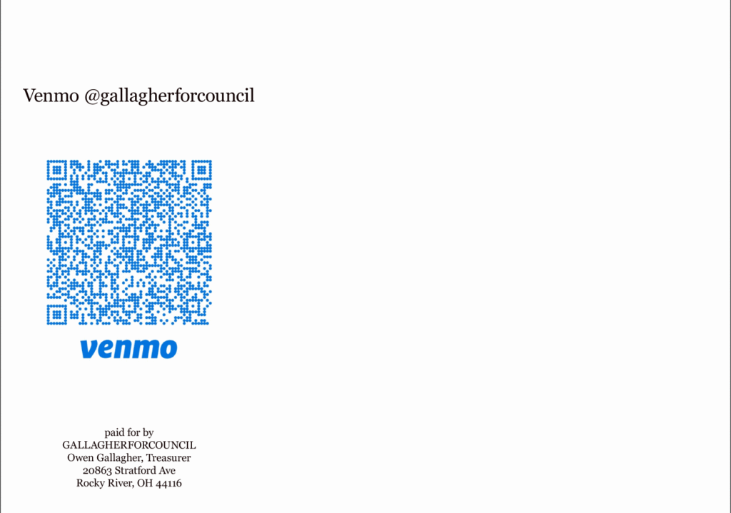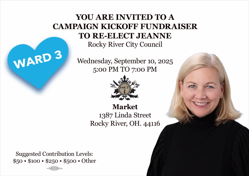 Our friend and Rocky River Councilwoman Jeanne Gallager is hosting a fundraiser for her re-election campaign on Wednesday, September 10th from 5-7pm at Market (1387 Linda Street). Please come out and support her campaign and use the QR code to donate and help us keep Rocky River BLUE!!