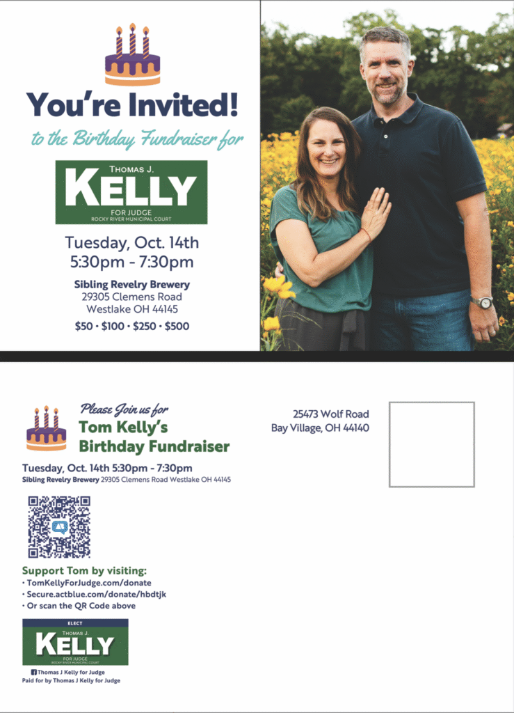 Our friend and supporter Tom Kelly is running for Rocky River Municipal Court Judge! Please support his campaign and learn more about Tom HERE! He is holding a fundraiser on Tuesday October 14th at Sibling Revelry in Westlake (29305 Clemens Rd) and is inviting everyone to join! Donate to his campaign HERE, attend his fundraiser, and help him make a last push to victory!!
