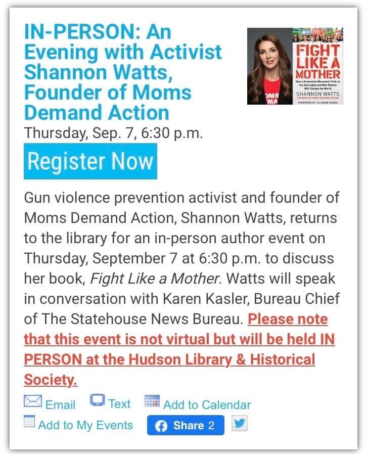 Shannon Watts will be at the Hudson library on September 7. Please join us in your red shirt!